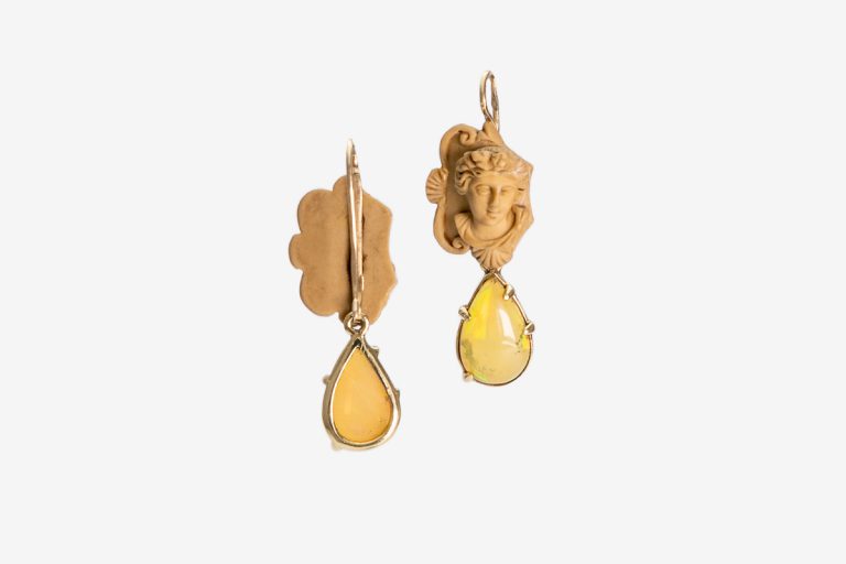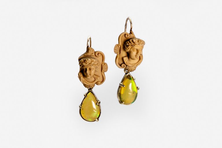 “Bij deze gouden oorhangers ben ik door de Romeinen geinspireerd. Deze uit de Victoriaanse tijd stammende, uit lava gesneden engelenkopjes zijn een schitterend voorbeeld van negentiende eeuws Italiaans vakmanschap. Opaal, afgeleid van het woord “opalus”, was voor de Romeinen de meest waardevolle edelsteen.”