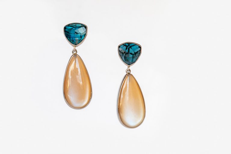 “Deze spectaculaire 14 karaat gouden moderne druppeloorbellen zijn gezet met glanzende, beige maanstenen, die mooi contrasteren met de gefacetteerde heldere ‘London Blue’ topaas van de stekers. Het geheel geeft iets extra’s aan je uiterlijk.”
